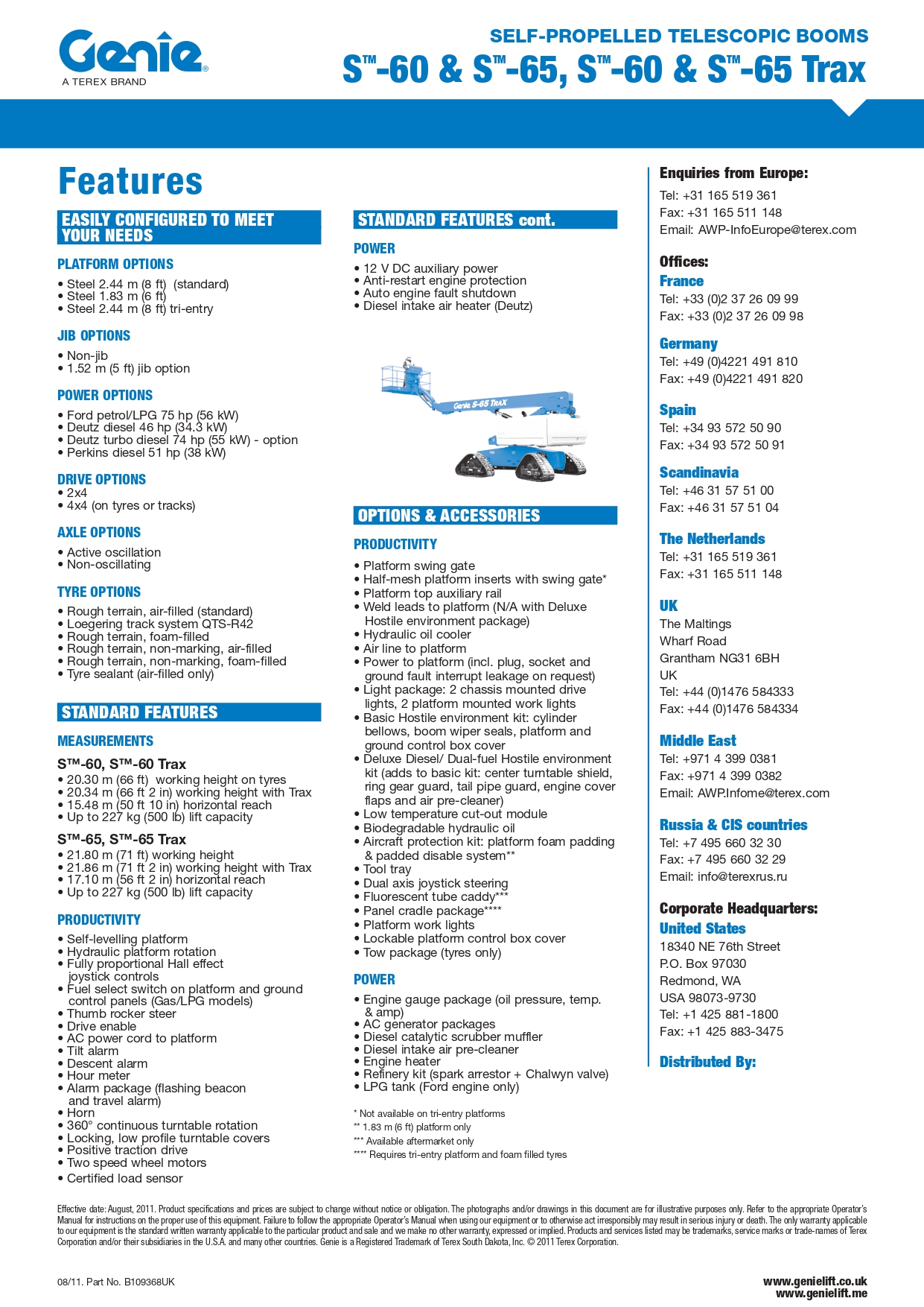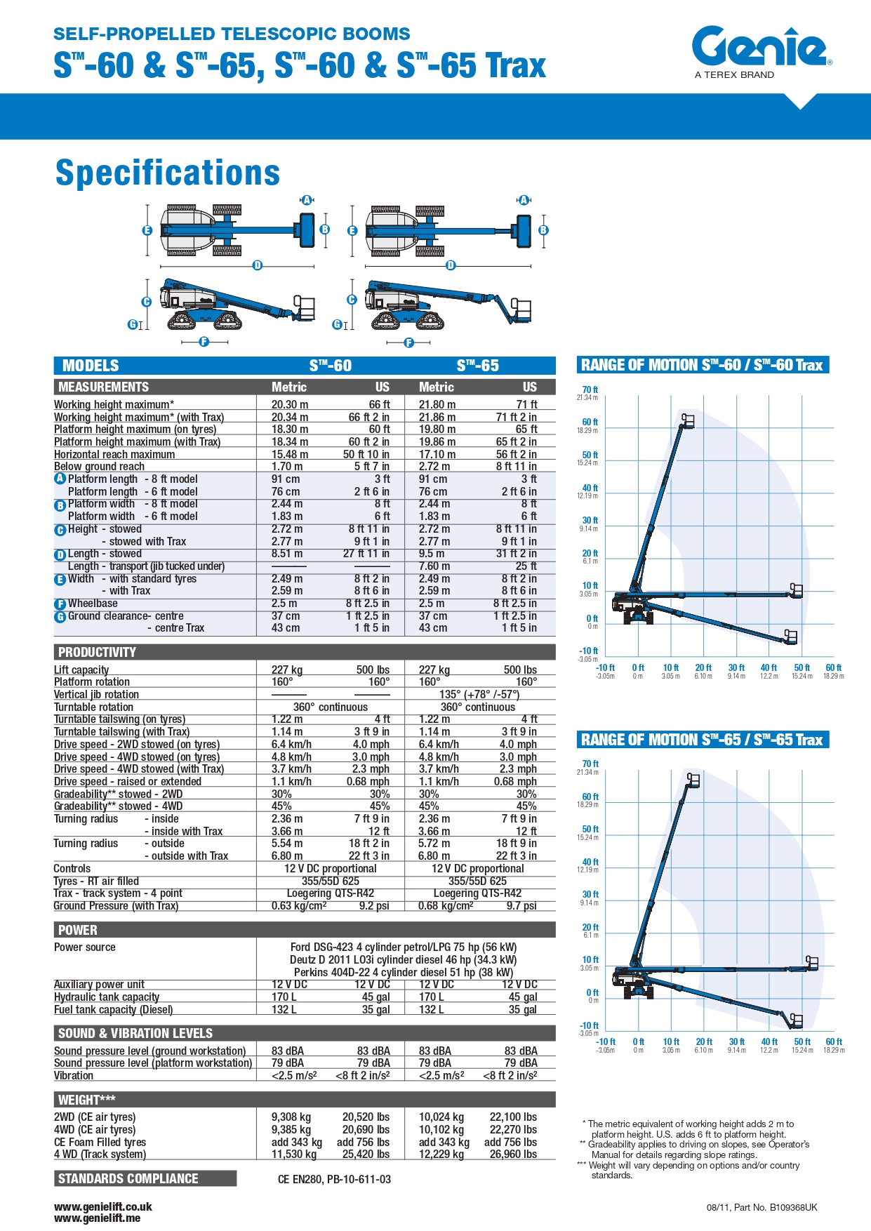 Met een maximale werkhoogte van ongeveer 21,8 meter heb je met de Genie S‑65 Trax toegang tot hoogtewerk dat je met veel andere machines niet kunt bereiken. Dankzij het horizontale bereik van circa 16,5–17,1 meter kun je eenvoudig zijdelings bij werkpunten komen zonder de machine telkens te verplaatsen.