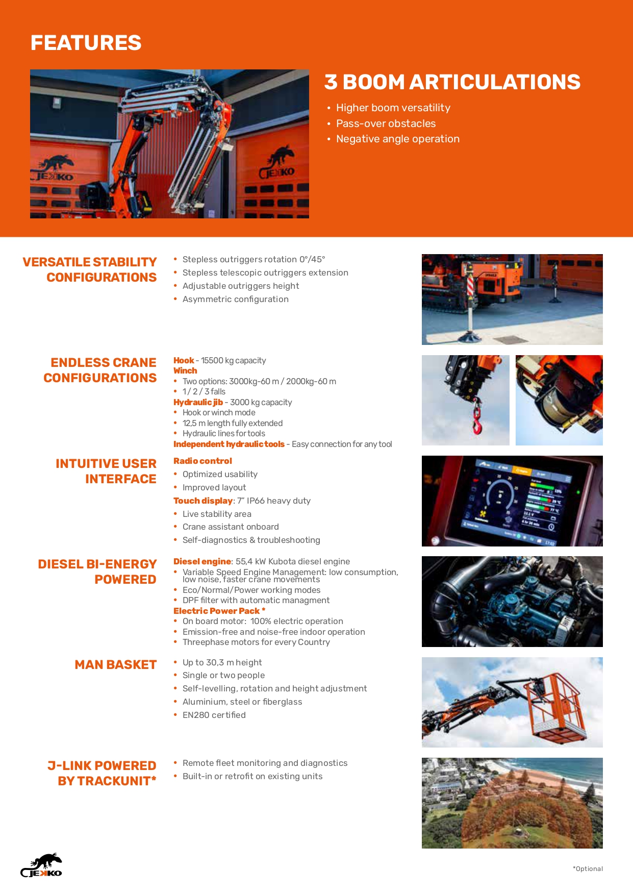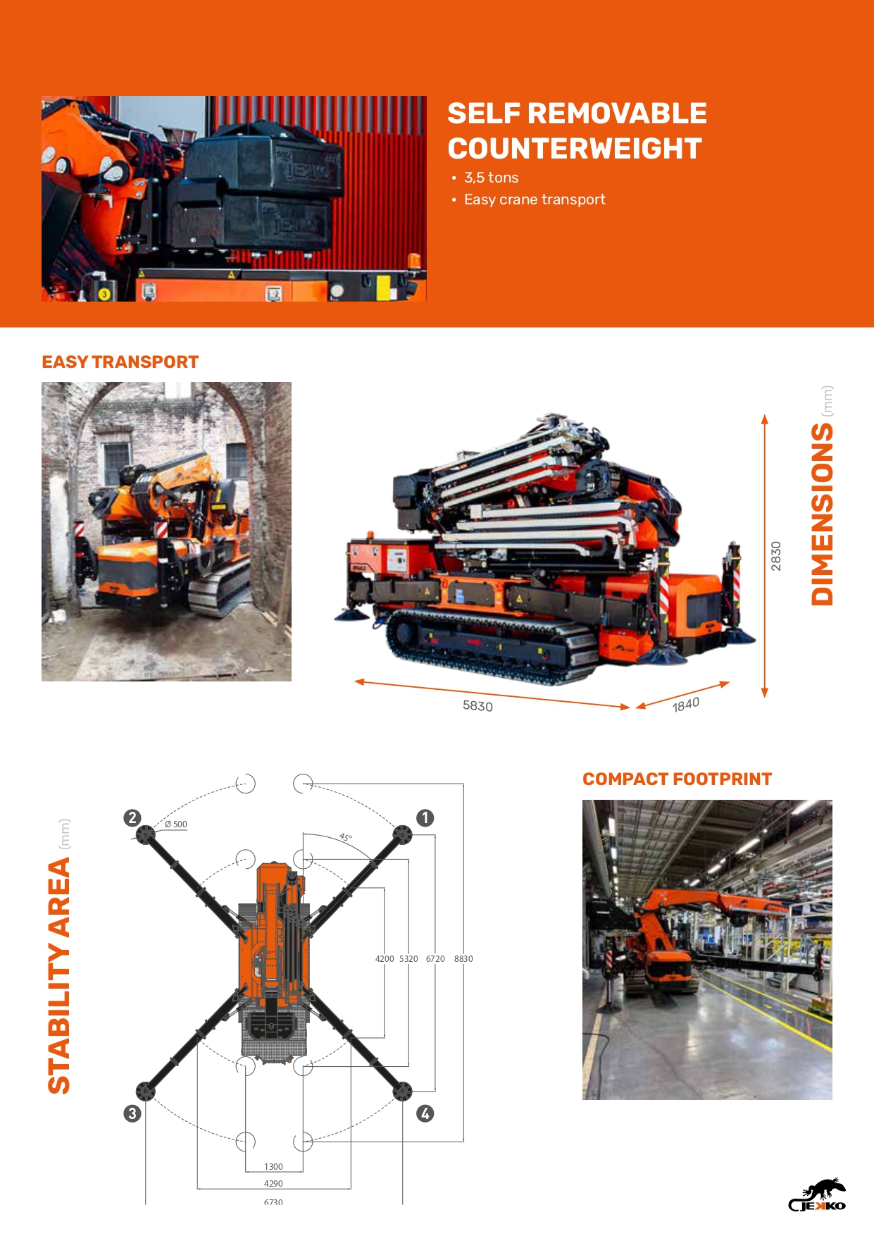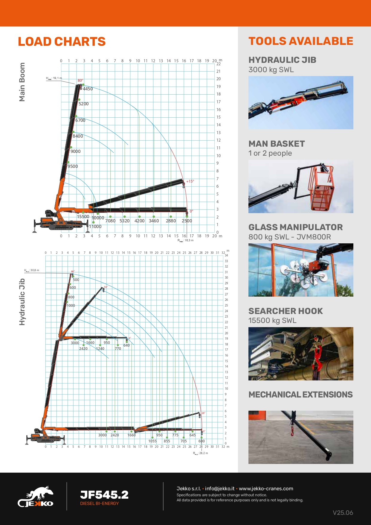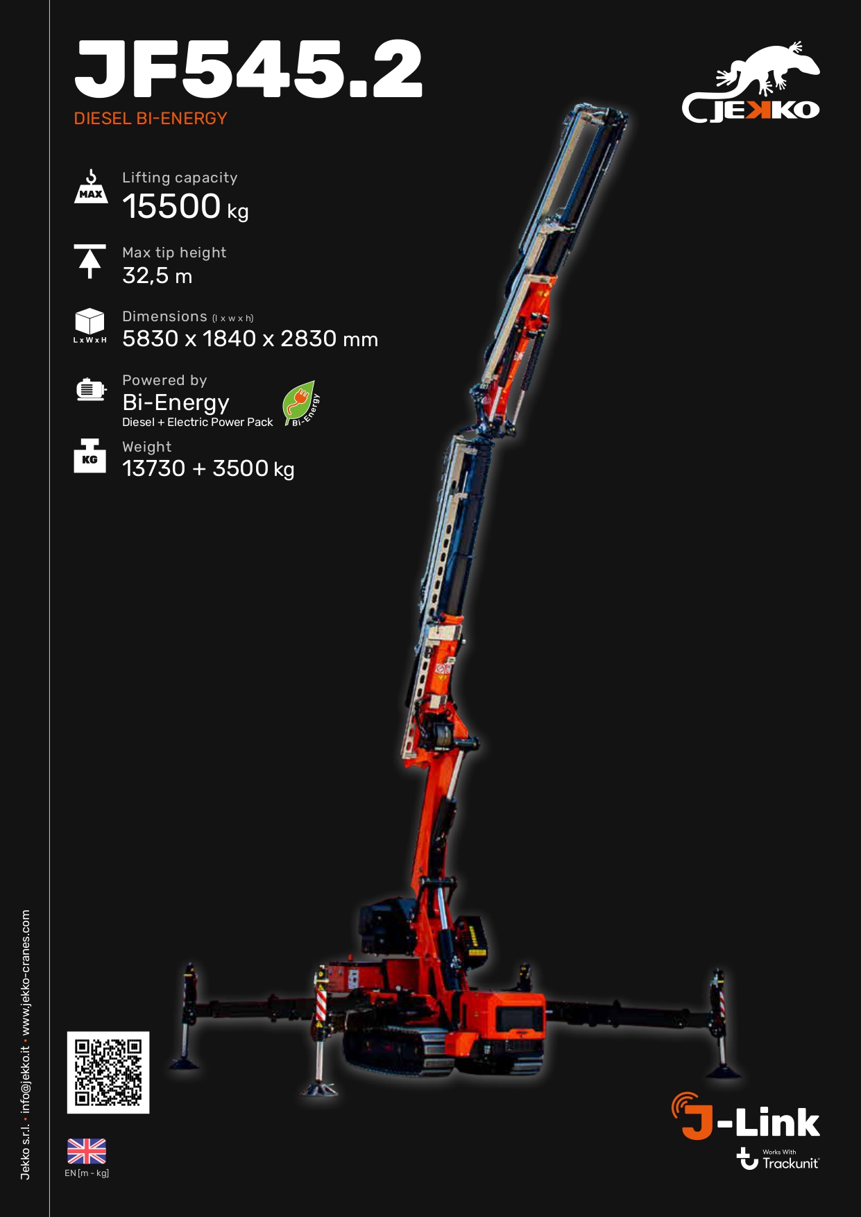 De Jekko JF545 is een krachtige minihijskraan die het beste combineert van mini- en rupskranen: compacte afmetingen met uitzonderlijke hijsprestaties. Met een maximale hijscapaciteit van 15.500 kg en een maximale haakhoogte tot 32,5 m is deze kraan ideaal voor veeleisende hijs- en montageklussen op bouwplaatsen, in industriële omgevingen en bij infrastructurele projecten en nog veel meer andere hijstoepassingen.