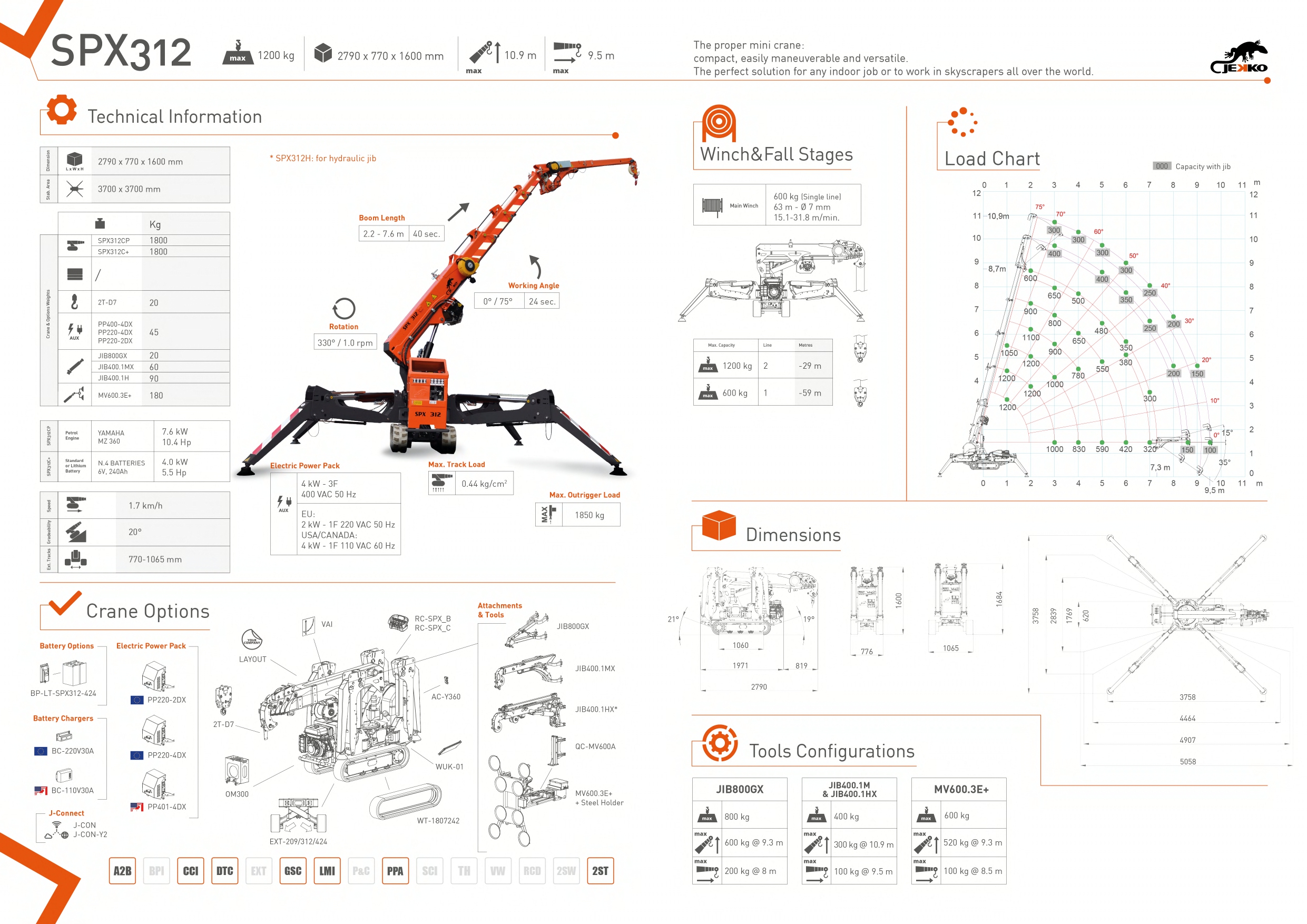 Dankzij de rupsaandrijving en uitschuifbare stabilisatoren staat de SPX312 stabiel op vrijwel iedere ondergrond. De kraan is leverbaar met diverse aandrijfopties (elektrisch, benzine of hybride), waardoor hij ook geschikt is voor emissiegevoelige omgevingen. De intuïtieve bediening – zowel handmatig als met afstandsbediening – zorgt voor maximale precisie en veiligheid tijdens het hijsen.