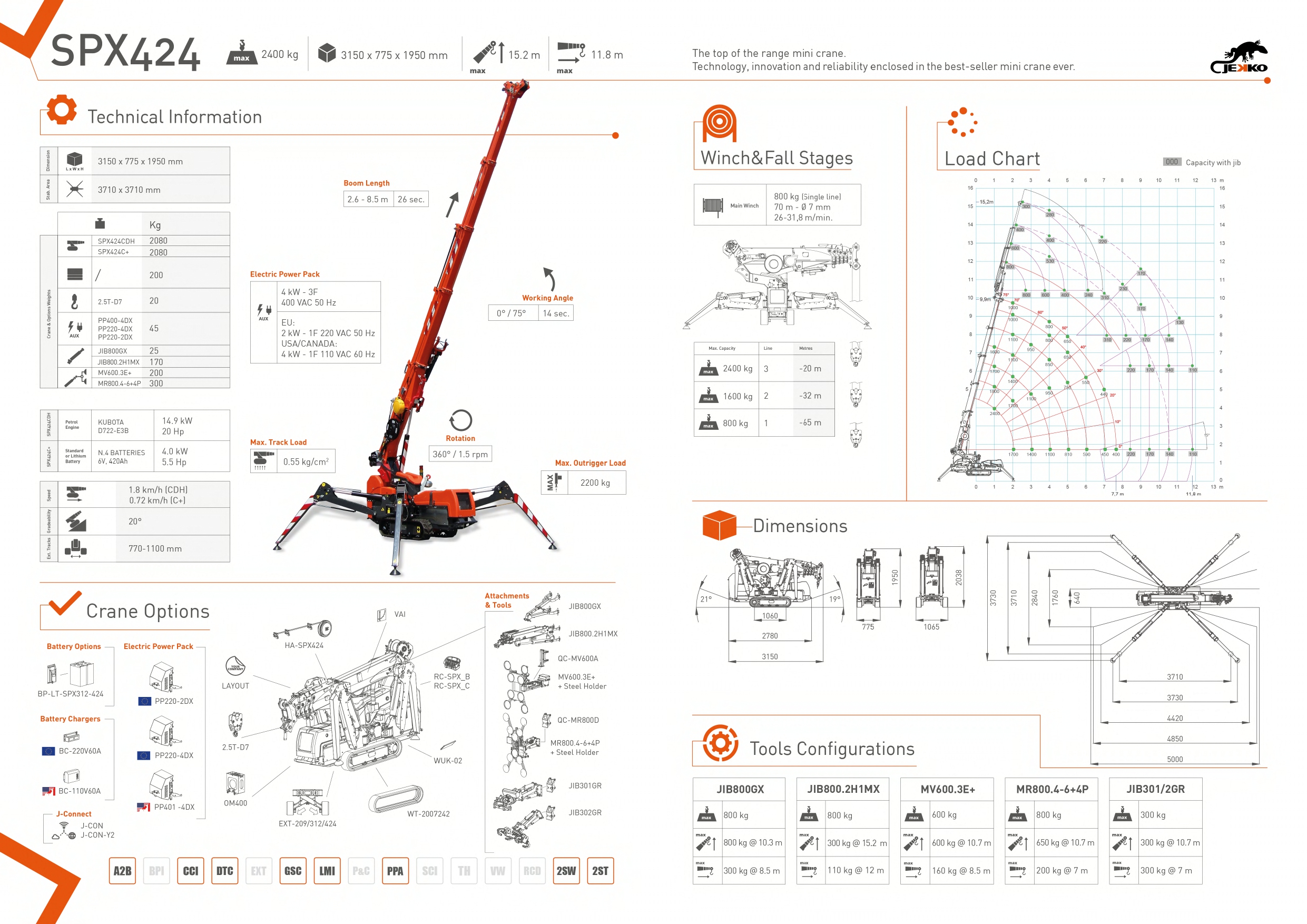 De Jekko SPX424 is een krachtige en compacte minihijskraan die uitblinkt in prestaties en wendbaarheid op krappe en moeilijk bereikbare locaties. Met een maximale hijscapaciteit van 2,400 kg is hij ideaal voor montagewerk, glasplaatsing, staalbouw, renovatie en andere precisietoepassingen waar grotere kranen niet passen.