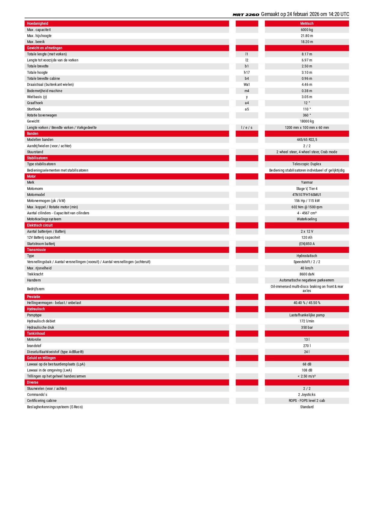 De Manitou MRT 2260 is een krachtige en veelzijdige roterende verreiker, ontworpen voor intensief gebruik in de bouw, industrie en agrarische sector. Met een maximale hefhoogte van circa 22 meter en een indrukwekkend hefvermogen tot 6.000 kg biedt de MRT 2260 uitstekende prestaties bij zware en complexe (hijs)werkzaamheden.